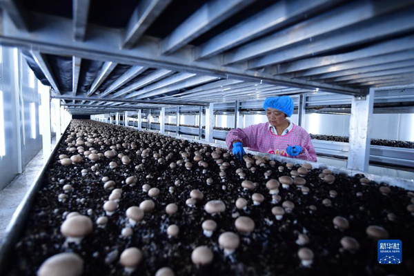 在河南兰考县东坝头乡张庄村,一名村民在一食用菌企业的车间内采摘褐蘑菇(2018年6月21日摄)。新华社记者 冯大鹏 摄