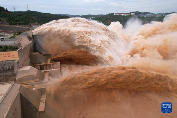 2021年10月12日拍摄的黄河小浪底水库泄洪场景(无人机照片)。新华社记者 尚昆仑 摄