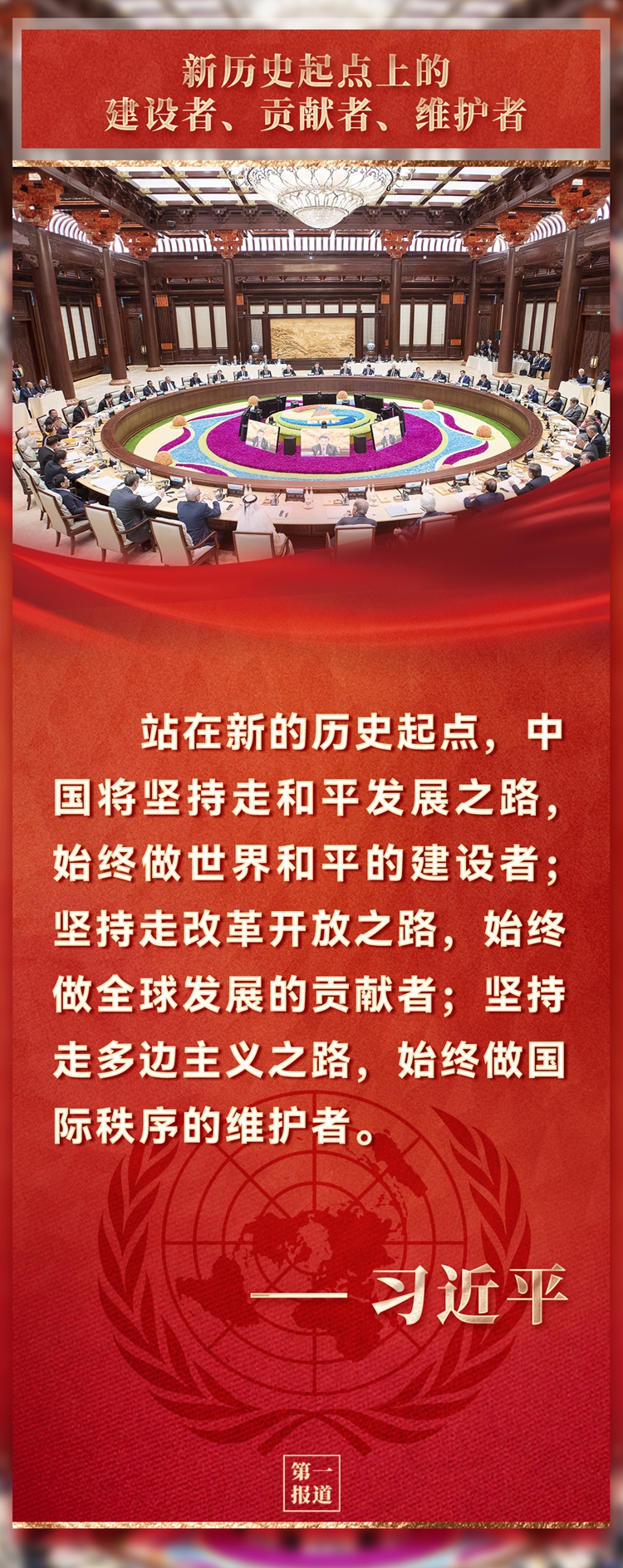 追昔抚今,鉴往知来。站在新的历史起点,中国将坚持走和平发展之路,始终做世界和平的建设者;坚持走改革开放之路,始终做全球发展的贡献者;坚持走多边主义之路,始终做国际秩序的维护者。