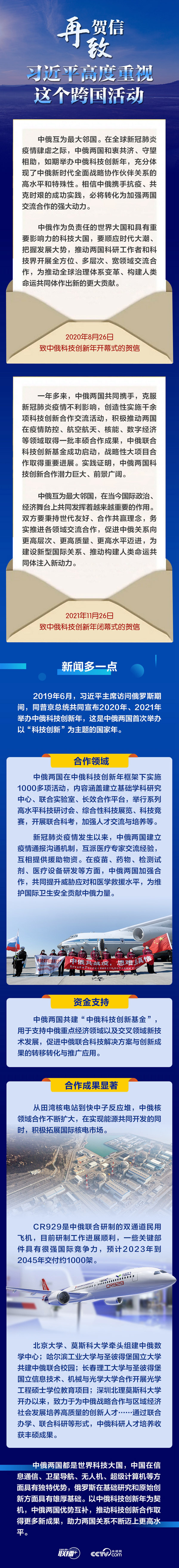 11月26日,习近平主席向中俄科技创新年闭幕式致贺信,赞许一年多来两国在疫情防控、航空航天、核能、数字经济等领域取得的合作成果。