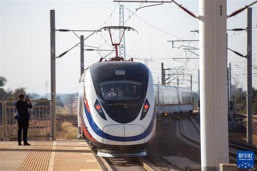 “澜沧号”动车组列车驶离老挝万象站(2021年12月3日摄)。新华社发(凯乔 摄)