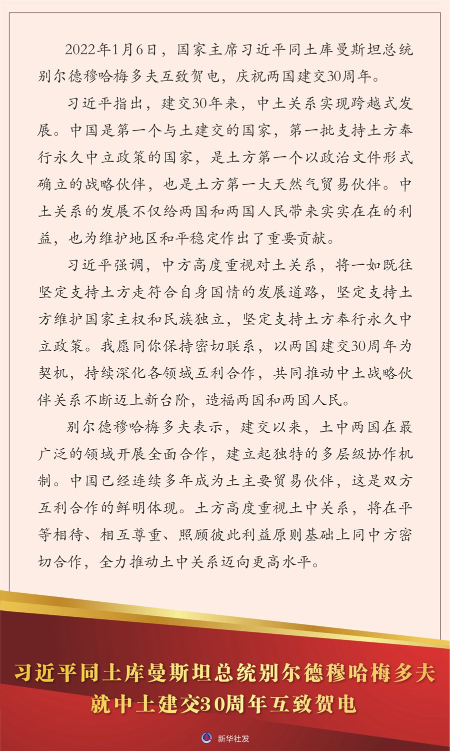 2022年1月6日,国家主席习近平同土库曼斯坦总统别尔德穆哈梅多夫互致贺电,庆祝两国建交30周年。