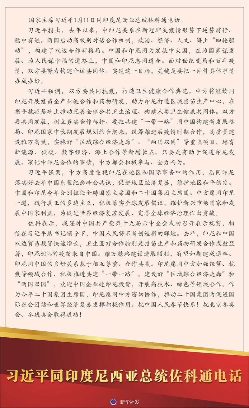 国家主席习近平1月11日同印度尼西亚总统佐科通电话。