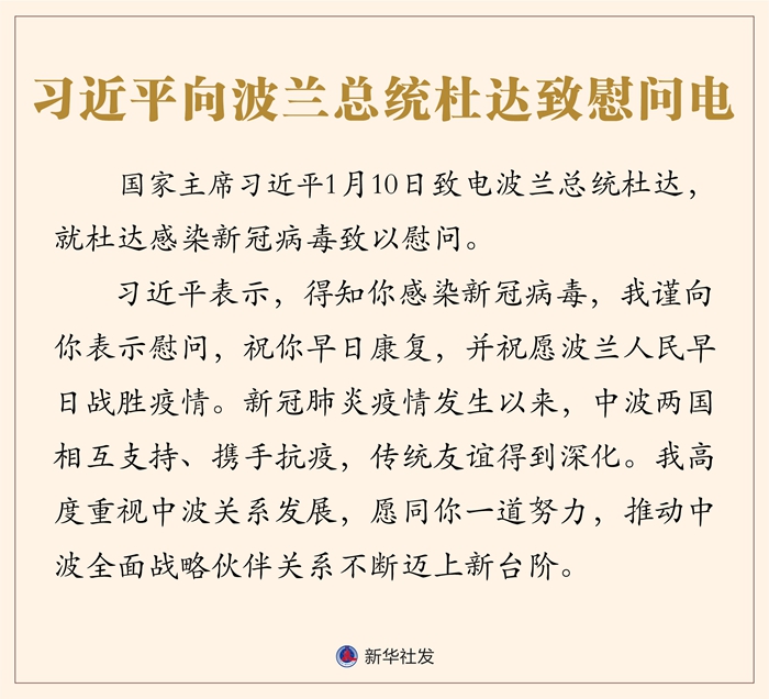习近平表示,得知你感染新冠病毒,我谨向你表示慰问,祝你早日康复,并祝愿波兰人民早日战胜疫情。新冠肺炎疫情发生以来,中波两国相互支持、携手抗疫,传统友谊得到深化。我高度重视中波关系发展,愿同你一道努力,推动中波全面战略伙伴关系不断迈上新台阶。