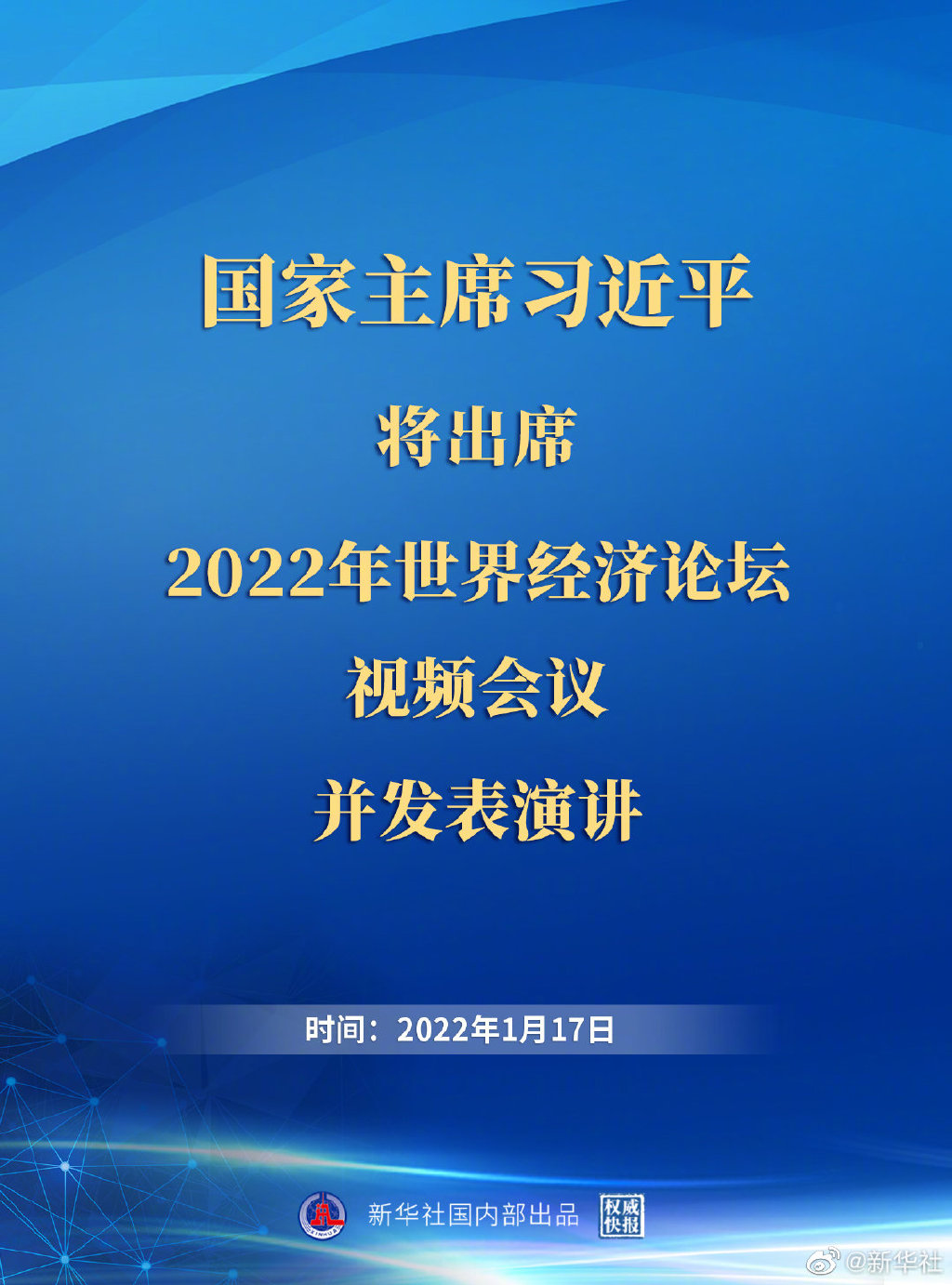 外交部发言人华春莹1月14日宣布:应世界经济论坛创始人兼执行主席施瓦布邀请,国家主席习近平将于1月17日在北京出席2022年世界经济论坛视频会议并发表演讲。