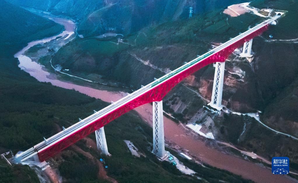 中老铁路首发列车驶过中国云南省元江哈尼族彝族傣族自治县境内的元江双线特大桥(2021年12月3日摄,无人机照片)。新华社记者 王冠森 摄