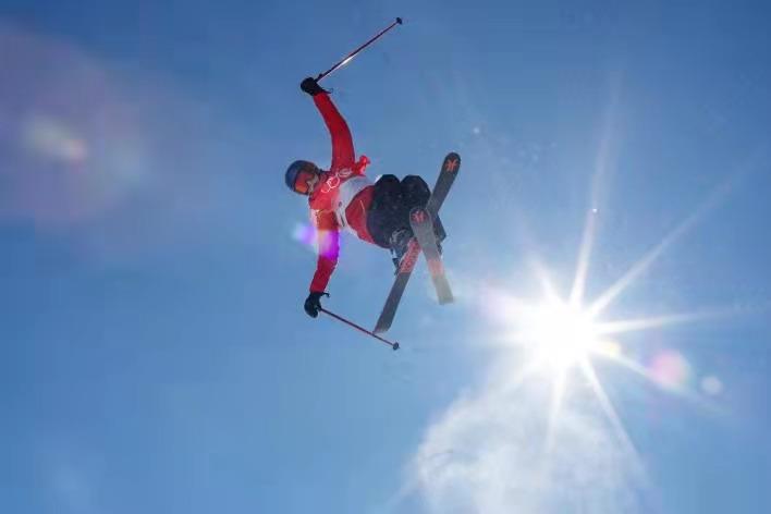 北京冬奥会期间,蓝天白云下,正在参加比赛的运动员。