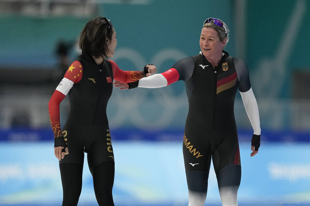 比赛结束后,中国选手阿合娜尔向德国老将佩希施泰因表达敬意,佩希施泰因微笑着鼓励阿合娜尔。