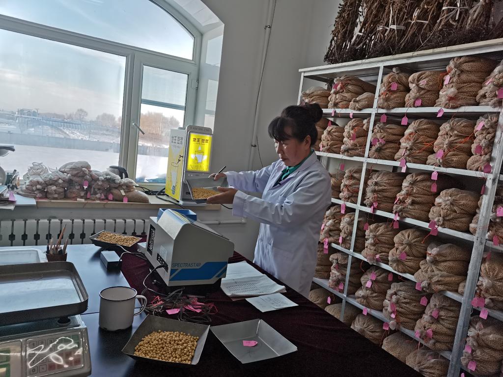 李艳华在测大豆蛋白、水分等数据。新华社记者王建 摄