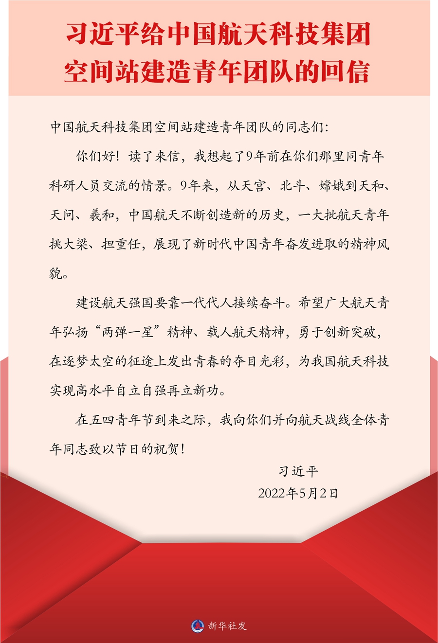 2013年5月4日,习近平曾到中国航天科技集团公司中国空间技术研究院,参加“实现中国梦、青春勇担当”主题团日活动,同各界优秀青年代表座谈。在中国共产主义青年团成立100周年之际,中国航天科技集团空间站建造青年团队给习近平总书记写信,代表该集团8万青年汇报9年来勇挑重担推动航天科技发展的情况,表达了为建设航天强国携手奋斗的坚定决心。