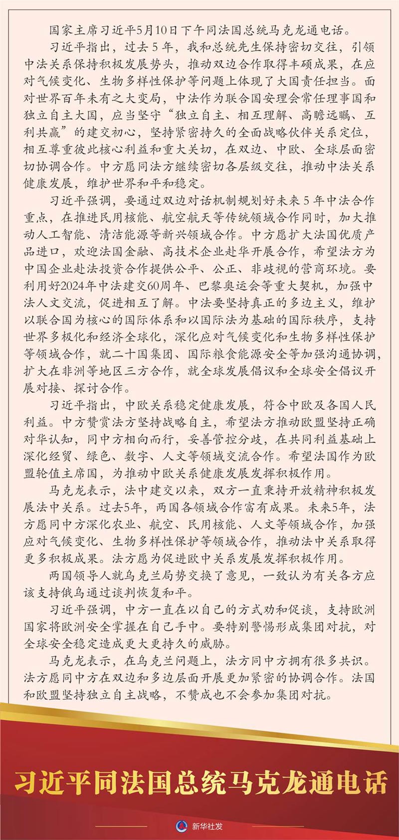 国家主席习近平5月10日下午同法国总统马克龙通电话。