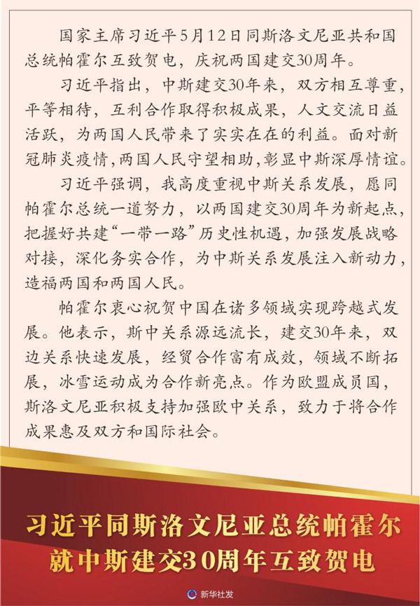帕霍尔衷心祝贺中国在诸多领域实现跨越式发展。他表示,斯中关系源远流长,建交30年来,双边关系快速发展,经贸合作富有成效,领域不断拓展,冰雪运动成为合作新亮点。作为欧盟成员国,斯洛文尼亚积极支持加强欧中关系,致力于将合作成果惠及双方和国际社会。