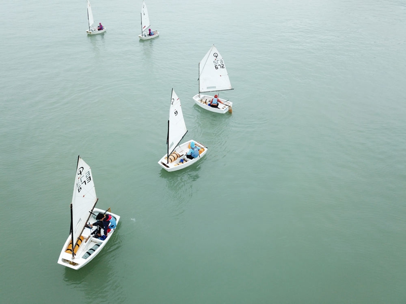 ↑2019年4月20日,浙江省台州市椒江区少体校大陈帆船帆板基地的孩子们在海上训练(无人机照片)。