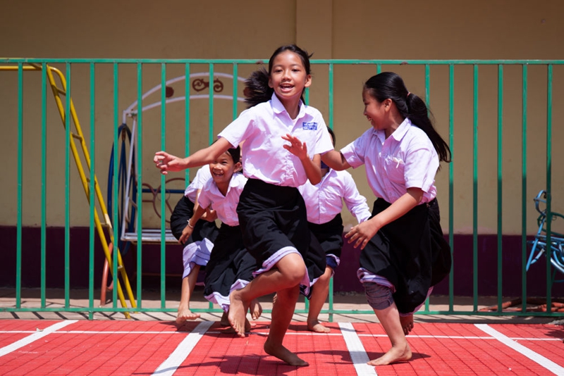 ↑2022年5月10日,孩子们在老挝中老友好农冰村小学开展体育活动。