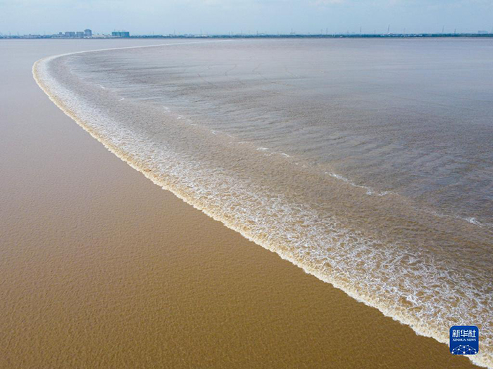 这是在杭州市钱塘新区拍摄的钱塘江一线潮奇观(2020年10月5日摄,无人机照片)。新华社记者江汉 摄