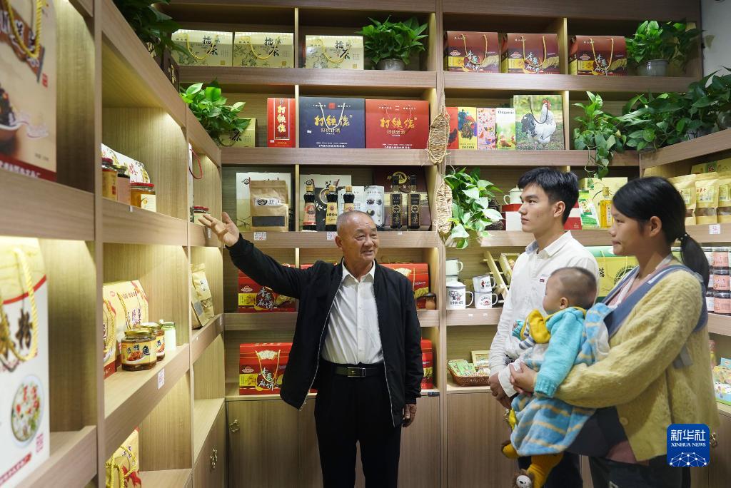 2020年10月21日,江西省赣州市于都县梓山镇潭头村村民孙观发(左一)向游客介绍当地的特色农产品。 新华社记者 万象 摄