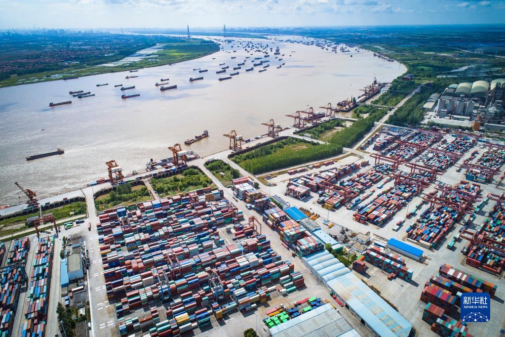 船舶在武汉阳逻港区水域行驶(2018年8月13日摄,无人机照片)。新华社记者 肖艺九 摄