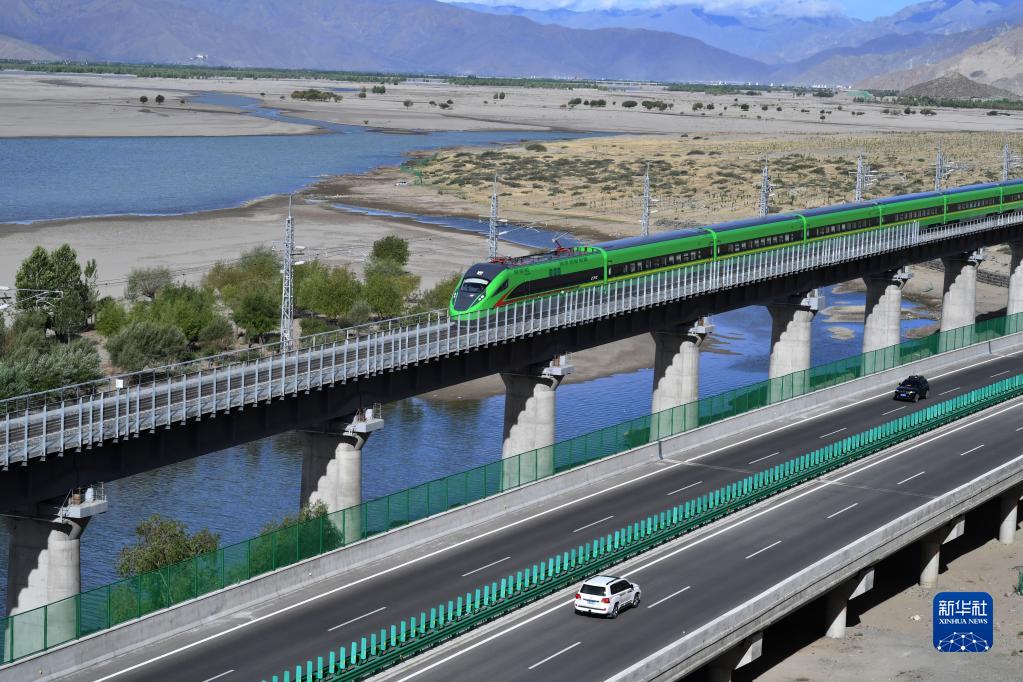 试运行的复兴号列车行驶在雅鲁藏布江畔(2021年6月16日摄)。新华社记者 觉果 摄
