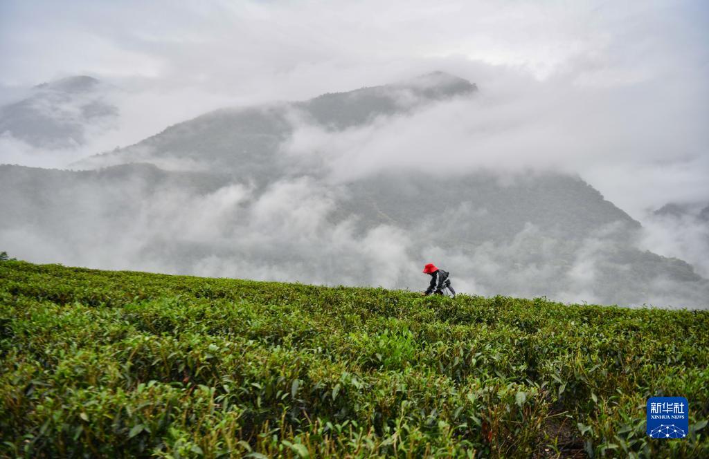 西藏林芝市墨脱县德兴乡荷扎村村民贡桑拉姆在采茶(4月16日摄)。新华社记者 晋美多吉 摄