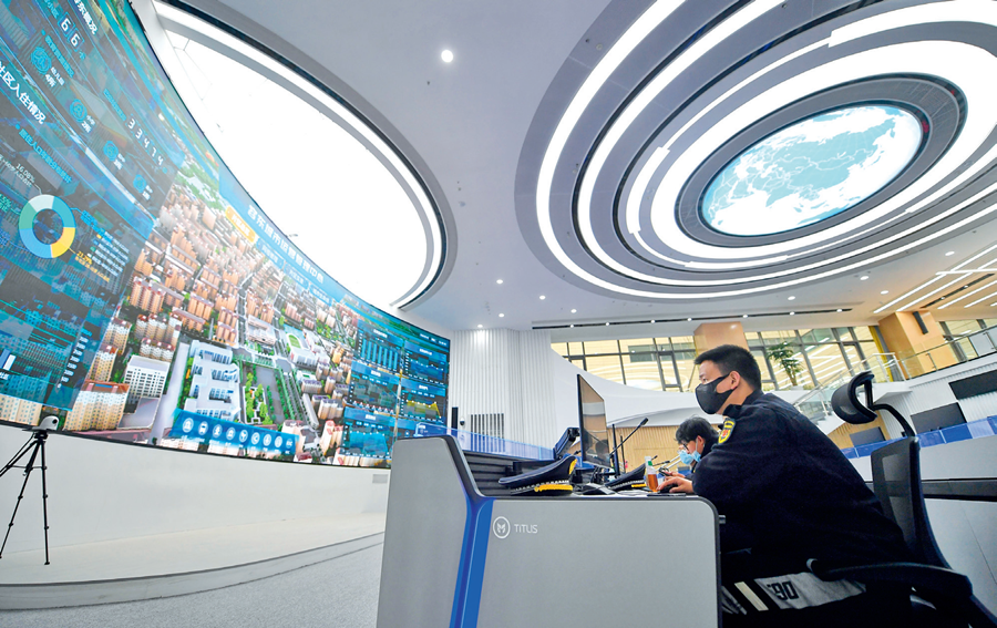 工作人员在雄安新区容东城市运营管理中心监管平台工作(2022年3月29日摄) 朱旭东摄/本刊