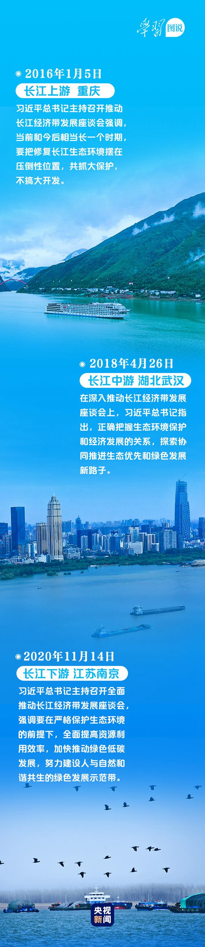党的十八大以来,习近平总书记先后来到长江上游、中游、下游,三次召开座谈会,为长江经济带发展把脉定向。