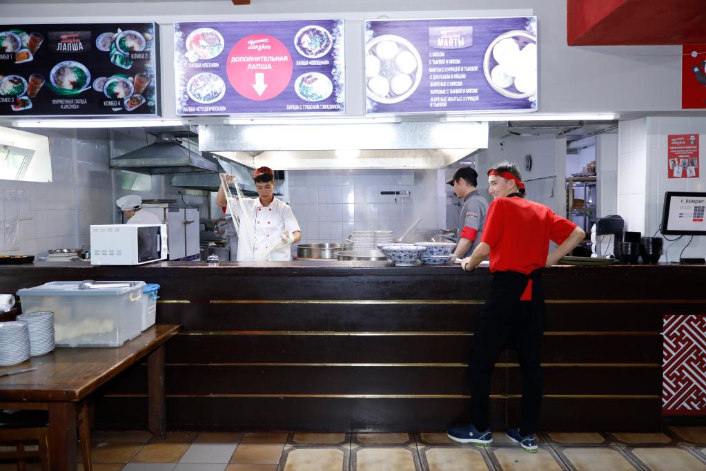 哈萨克斯坦首都努尔苏丹,在当地人开办经营的中国兰州拉面风味连锁餐馆“Lanzhou”,厨师正在抻拉面条。新华社发