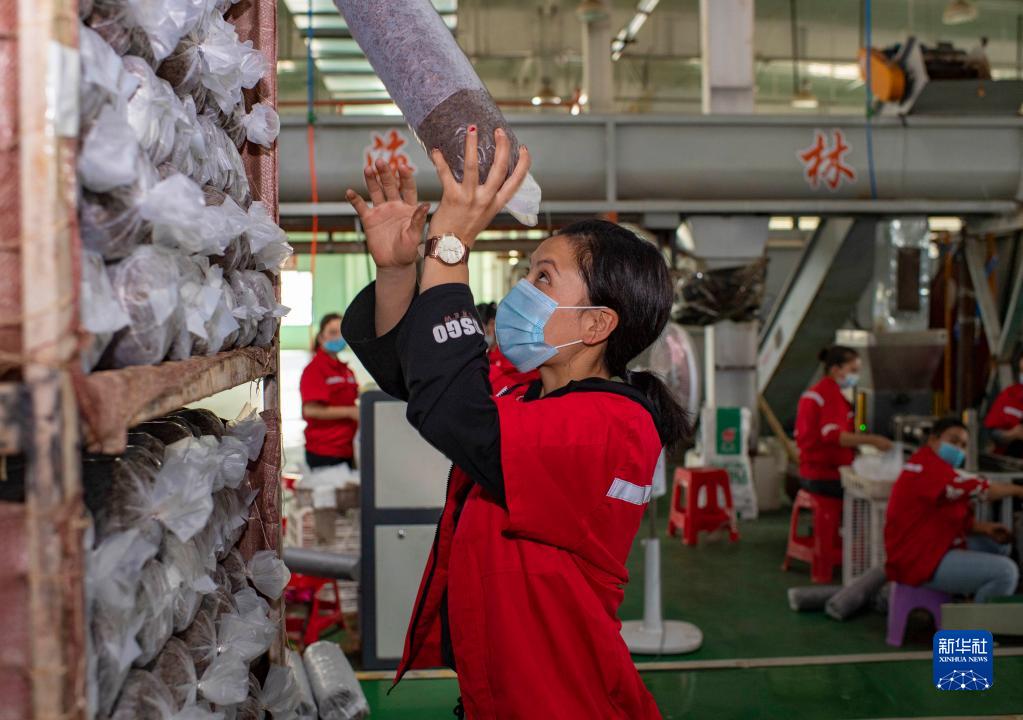 新疆墨玉县萨依巴格乡村民阿孜古丽·阿卜力提甫在当地一家菌业公司的菌种装袋车间工作(2020年9月22日摄)。新华社记者 胡虎虎 摄