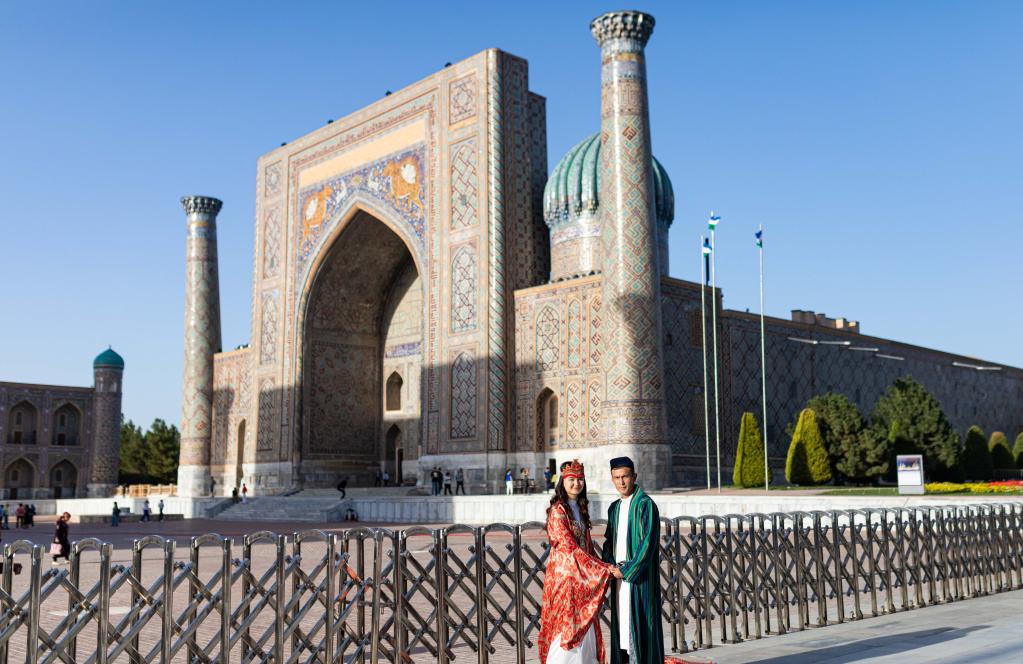 9月12日,在乌兹别克斯坦撒马尔罕,情侣在列吉斯坦广场前留影。新华社记者 白雪骐 摄