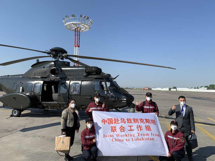 2020年4月19日,在乌兹别克斯坦首都塔什干,穆罗江·肯杰柏耶夫(右一)准备陪同4名中国政府联合医疗工作组成员飞往撒马尔罕。新华社发