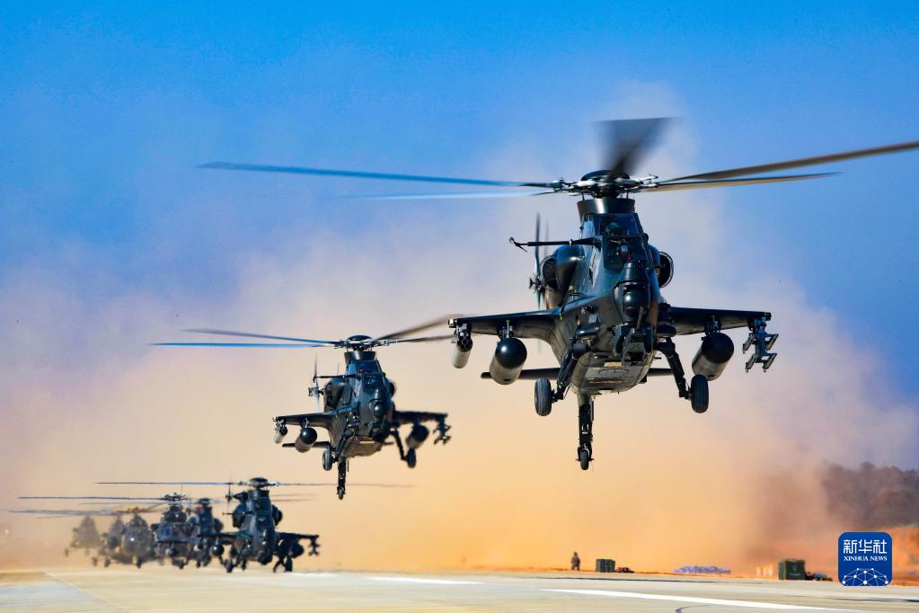 陆军第73集团军某陆航旅组织飞行训练,战机编队依次起飞(2021年4月22日摄)。新华社发(李士龙 摄)