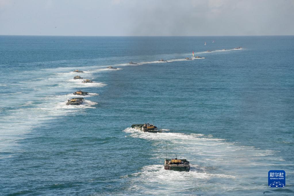 陆军第74集团军某合成旅两栖装甲车进行海上泛水编波训练(2020年8月14日摄)。新华社发(李彬 摄)