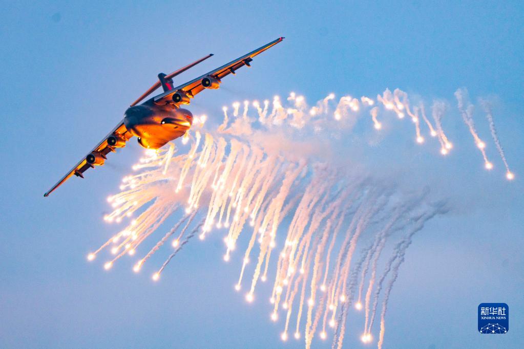 中部战区空军航空兵某团运-20飞机进行释放干扰弹训练(2020年12月10日摄)。新华社发(张猛 摄)