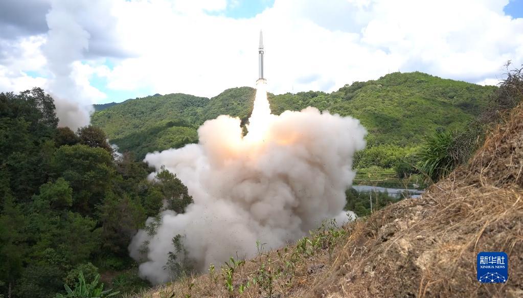 东部战区火箭军对台岛东部外海预定海域实施火力突击。这是导弹发射升空(2022年8月4日,视频截图)。新华社发