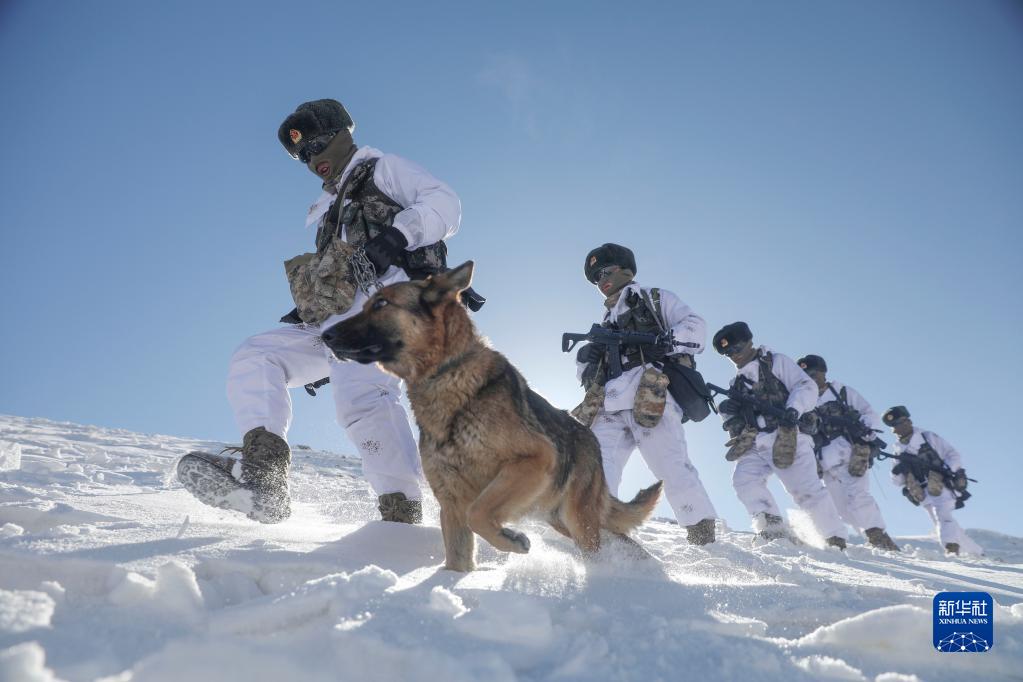 驻守帕米尔高原的新疆喀什军分区某边防团托克满苏边防连官兵按计划对海拔5100米的山口实施例行巡逻(2021年2月11日摄)。新华社发(姬文志 摄)