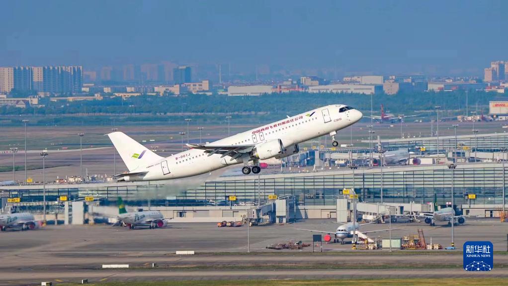 2022年5月14日6时52分,编号为B-001J的C919大飞机从上海浦东机场第4跑道起飞,于9时54分安全降落,标志着中国商飞公司即将交付首家用户的首架C919大飞机首次飞行试验圆满完成。新华社发
