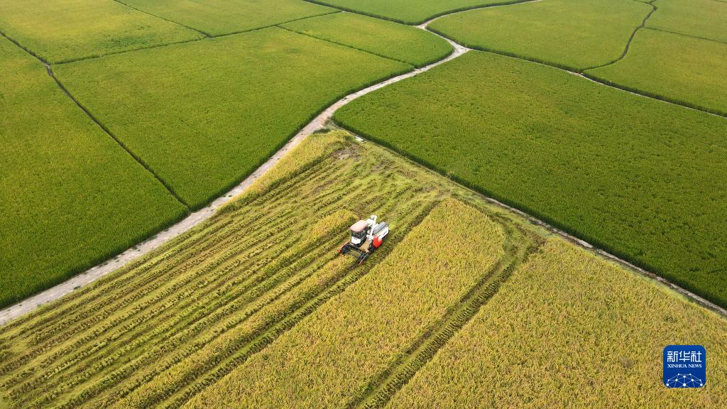 2022年9月28日,合肥市肥西县花岗镇河丰社区村民驾驶收割机收获中稻(无人机照片)。新华社发(徐勇 摄)