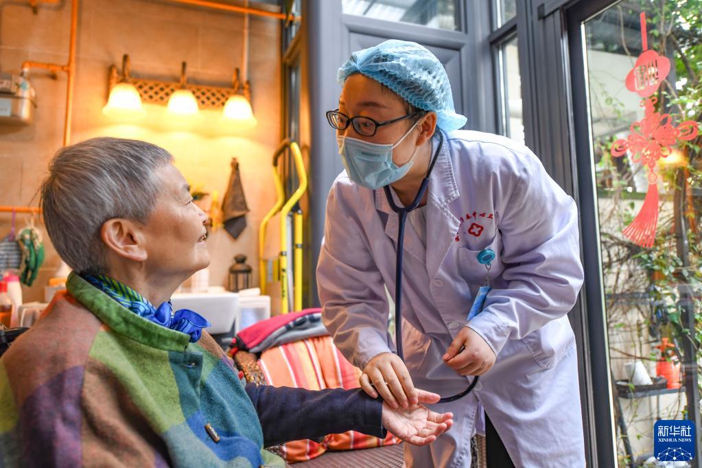 在成都市温江区万春镇天乡路社区居民家中,家庭医生杨静(右)在询问居民叶茂群近期的身体情况(2022年5月18日摄)。近年来,成都市温江区积极推进基层慢病分级诊疗服务,优先将高血压、糖尿病等慢病患者纳入家庭医生签约服务范围。新华社记者 王曦 摄