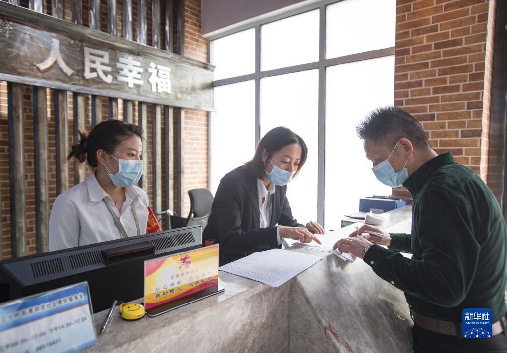 2020年9月18日,湖北省武汉市青和居社区服务中心工作人员协助社区居民填写材料。新华社记者 肖艺九 摄