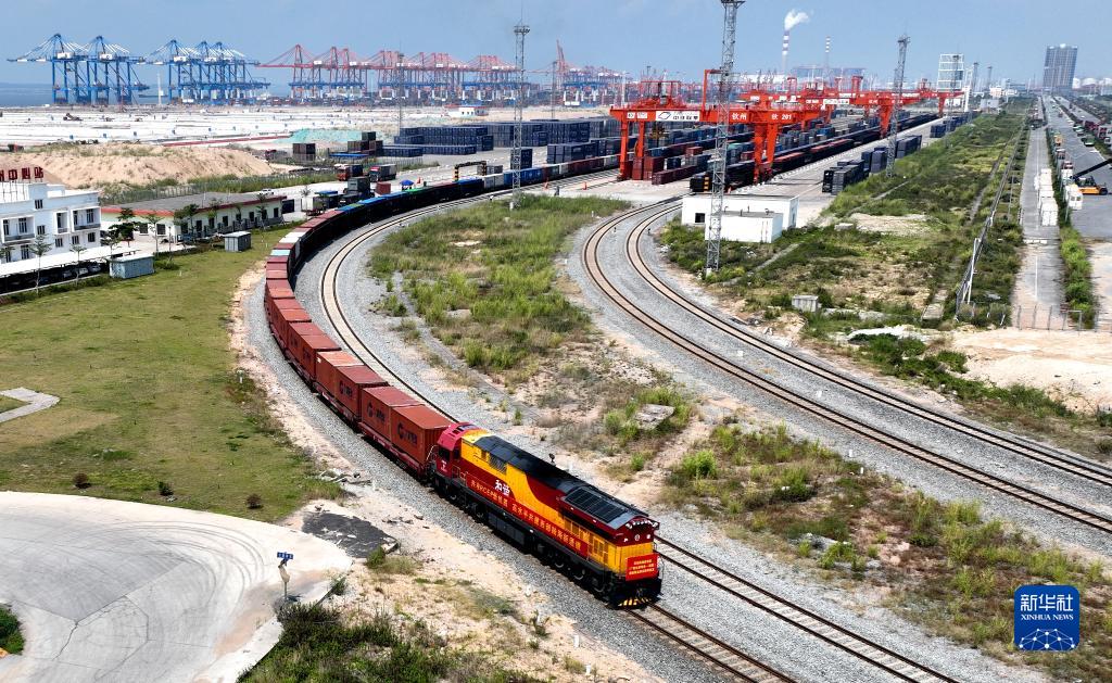 这是从广西钦州港发出的首趟“北部湾—西藏”班列(2022年9月17日摄,无人机照片)。新华社记者 张爱林 摄