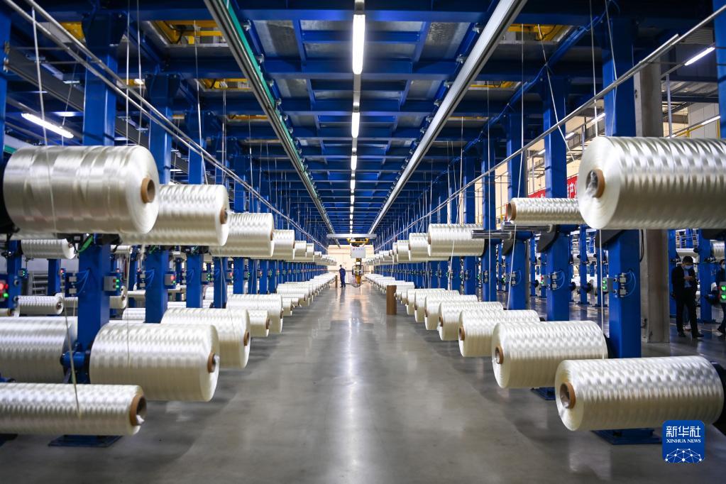 在吉林化纤集团国兴碳纤维公司生产车间,工人在整理碳纤维原丝(2022年10月31日摄)。新华社记者 颜麟蕴 摄
