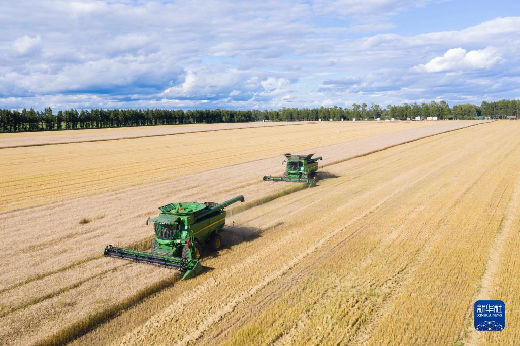 联合收割机在黑龙江北大荒集团红星农场有限公司田间收获小麦(2022年8月10日摄,无人机照片)。新华社记者 谢剑飞 摄