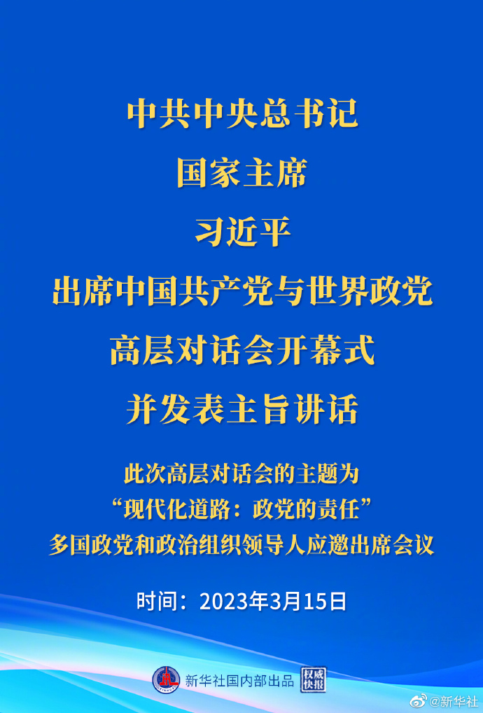 北京时间3月15日,中国共产党与世界政党高层对话会以视频连线方式举行,中共中央总书记、国家主席习近平出席高层对话会开幕式并发表主旨讲话。此次高层对话会的主题为“现代化道路:政党的责任”,多国政党和政治组织领导人应邀出席会议。
