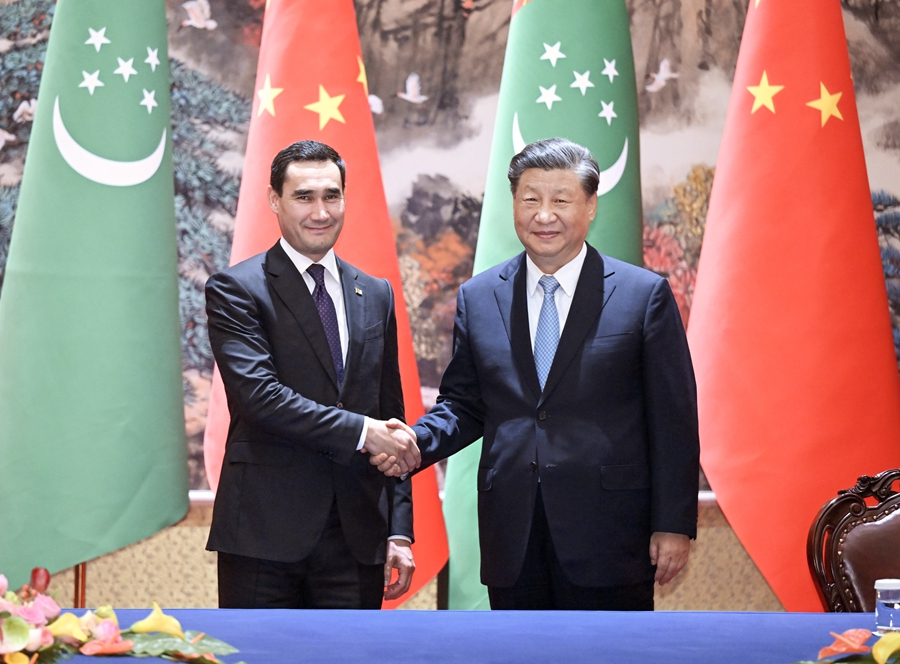 5月18日下午,国家主席习近平在西安会见来华出席中国-中亚峰会的土库曼斯坦总统别尔德穆哈梅多夫。会见后,两国元首共同见证签署科技、海关等领域多项双边合作文件。新华社记者 谢环驰 摄