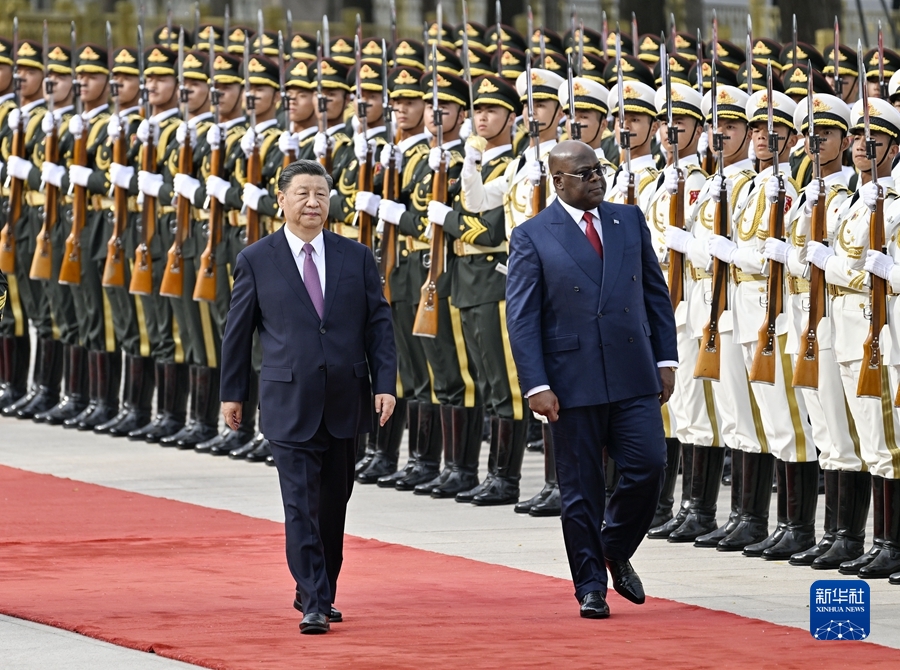 5月26日下午,国家主席习近平在北京人民大会堂同来华进行国事访问的刚果(金)总统齐塞克迪举行会谈。这是会谈前,习近平在人民大会堂东门外广场为齐塞克迪举行欢迎仪式。新华社记者 刘卫兵 摄