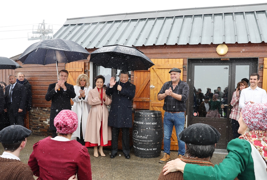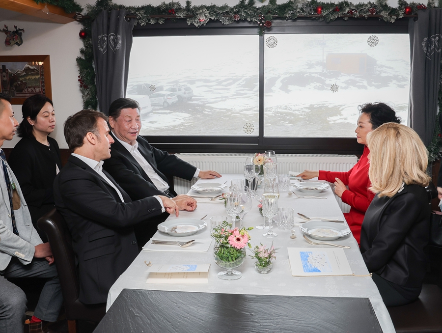 马克龙总统和布丽吉特在图尔马莱山口“牧羊人驿站”迎接习近平和彭丽媛,共同欣赏当地村民表演的具有浓郁南法风情的牧羊人之舞,并同他们亲切合影。