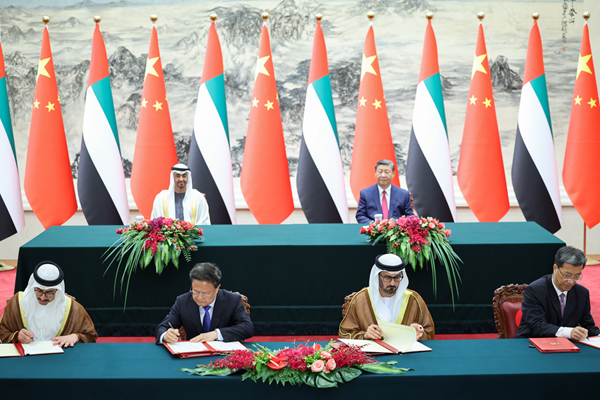 习近平指出,阿联酋是中国重要的全面战略伙伴。近年来,在我们共同引领下,中阿关系保持良好发展势头,树立了新时期中国和阿拉伯国家关系的典范。今年是中阿两国建交40周年,是中阿关系承上启下、继往开来的重要节点。中方愿同阿方一道,继续从战略高度和长远角度牢牢把握两国关系大方向,确保中阿全面战略伙伴关系始终蓬勃发展。