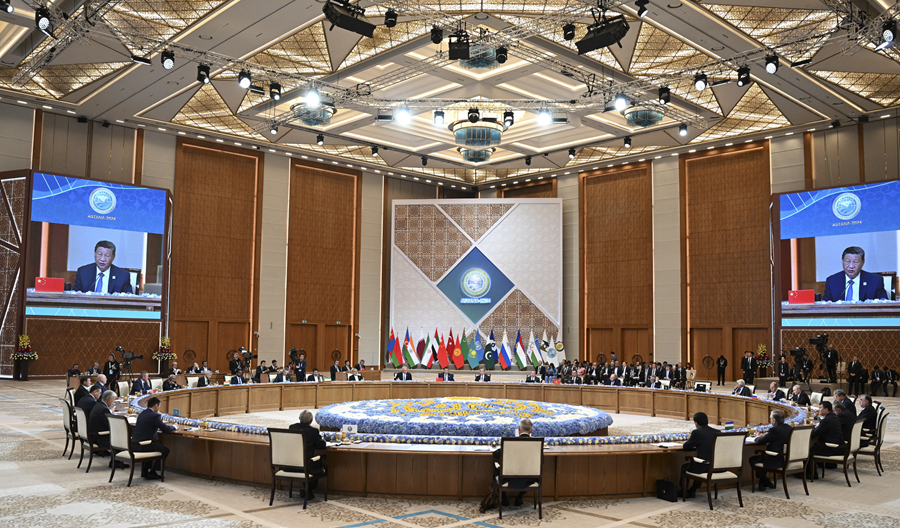 当地时间7月4日上午,国家主席习近平在阿斯塔纳独立宫出席上海合作组织成员国元首理事会第二十四次会议。新华社记者 谢环驰 摄
