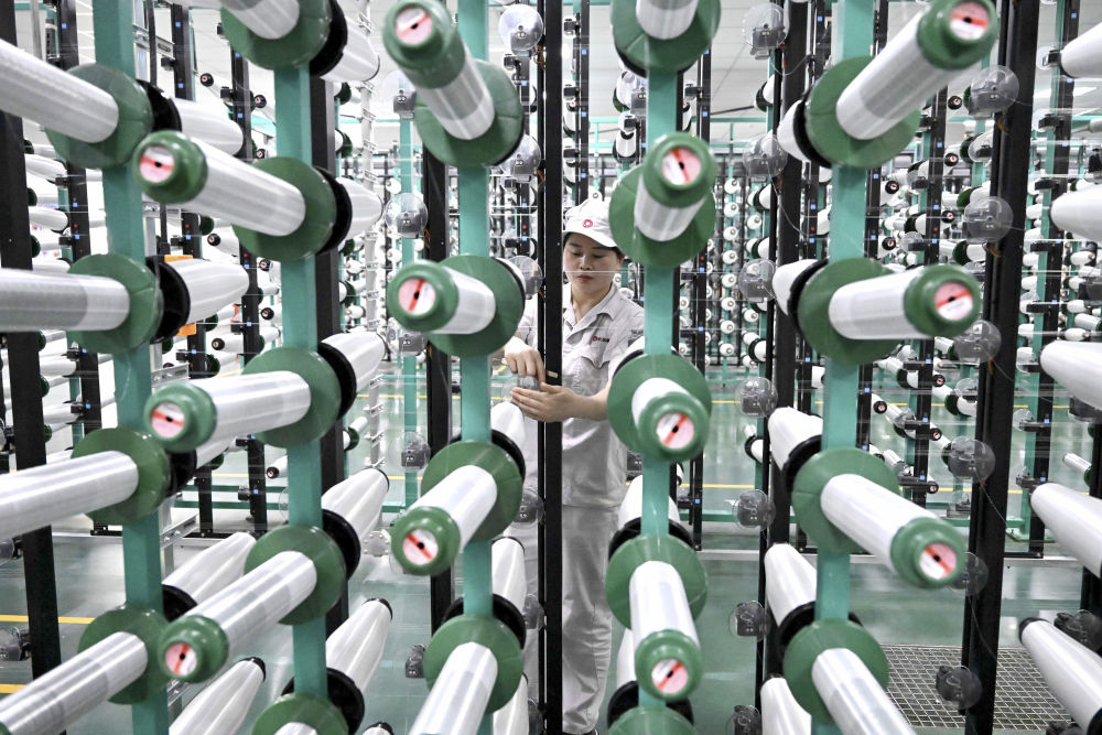 在位于河南安阳林州市的河南光远新材料股份有限公司电子布准备车间,工作人员在检查整经机机台(2024年2月22日摄)。该公司通过自主技术创新,攻克“卡脖子”技术,研发出5G用低介电电子纱、5G用超薄电子布等产品。新华社记者 李安 摄