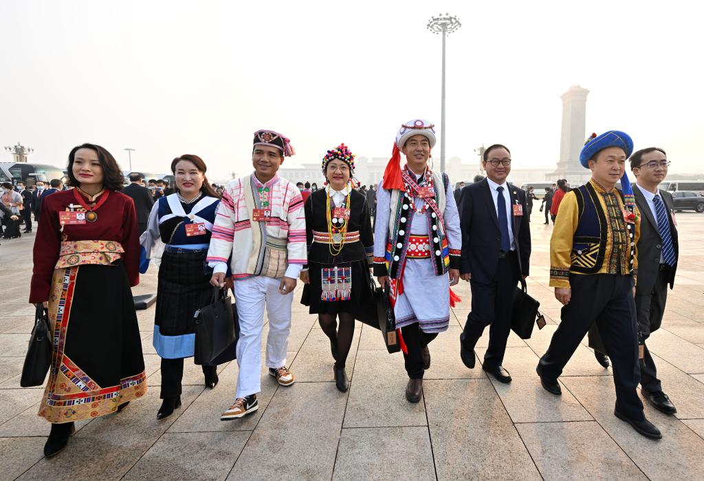 2023年3月5日,第十四届全国人民代表大会第一次会议在北京人民大会堂开幕。这是全国人大代表走向会场。新华社记者 陈益宸 摄