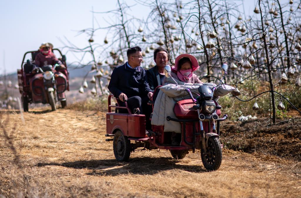 全国人大代表袁海波(右三)在云南省曲靖市马龙区一种植基地了解务工人员就业需求(2023年2月11日摄)。新华社记者 江文耀 摄